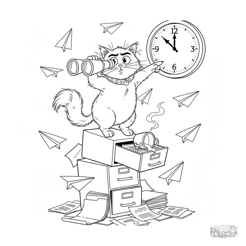 Página para colorear para niños 10-12: un gato de oficina caótico con prismáticos, en equilibrio sobre archivadores, mirando el reloj con pánico.
