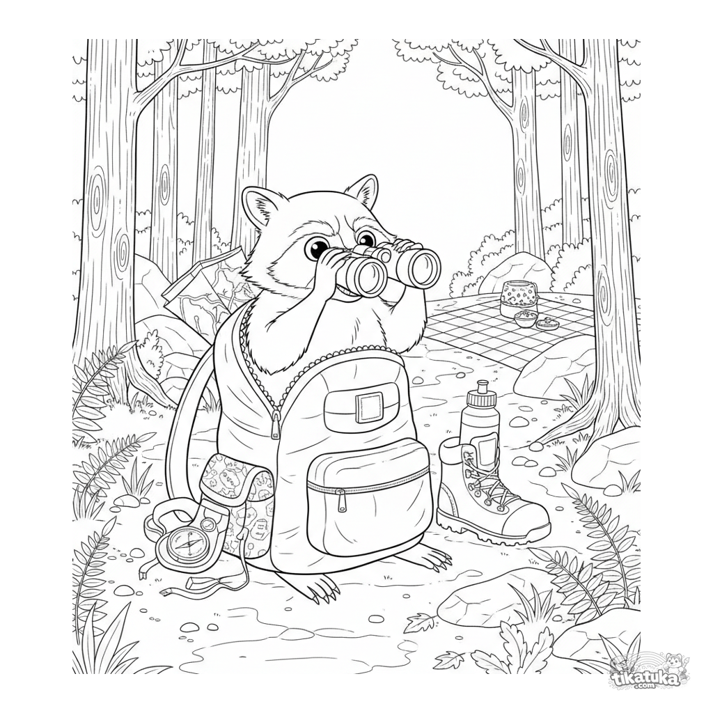Página para colorear para niños 10-12: un mapache espía caótico asomándose desde una mochila en un sendero forestal, observando un picnic con prismáticos. Escena de meme detallada y divertida.