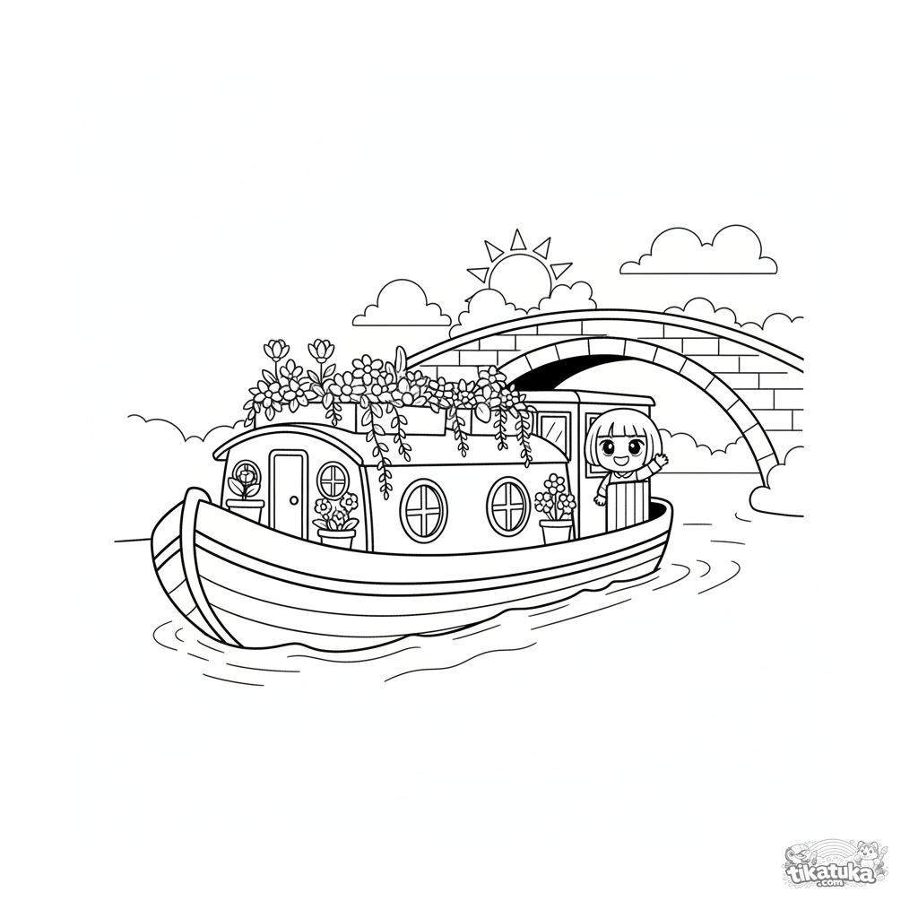 Página para colorear para niños de 4-6 años: una barcaza alegre con cajas de flores navega por un canal bajo un puente de piedra.