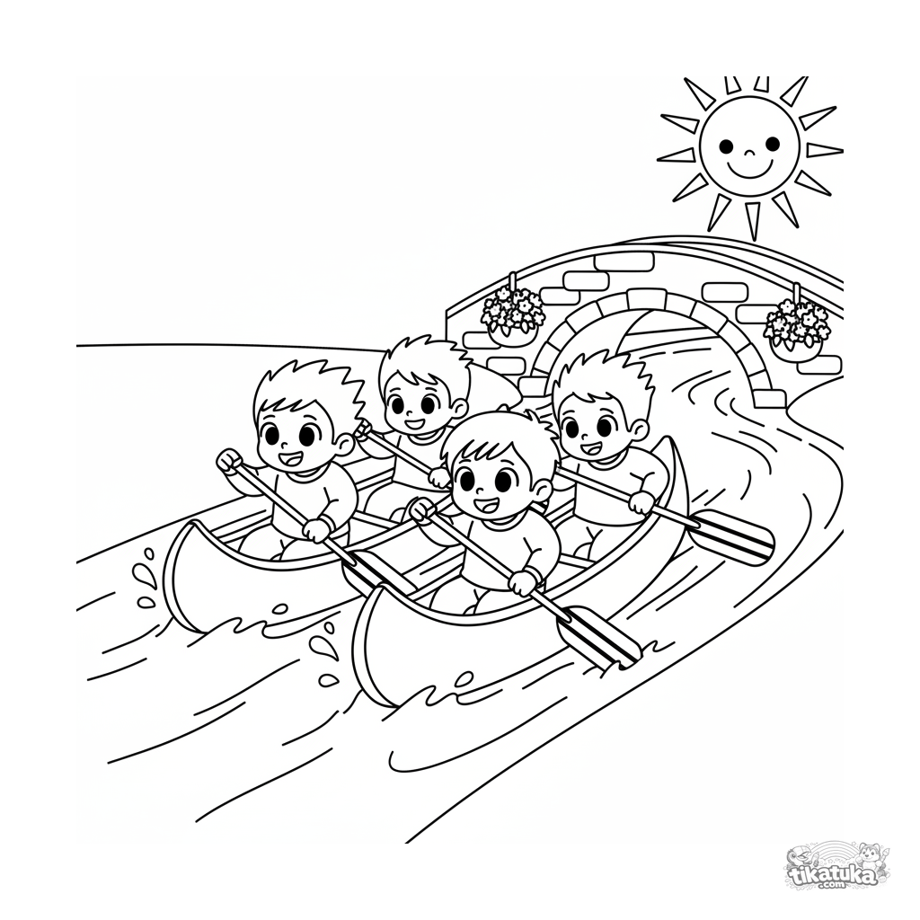 Página para colorear para niños 4-6: canoas alegres compiten por un canal soleado bajo un puente de piedra. Escena dinámica con formas legibles.