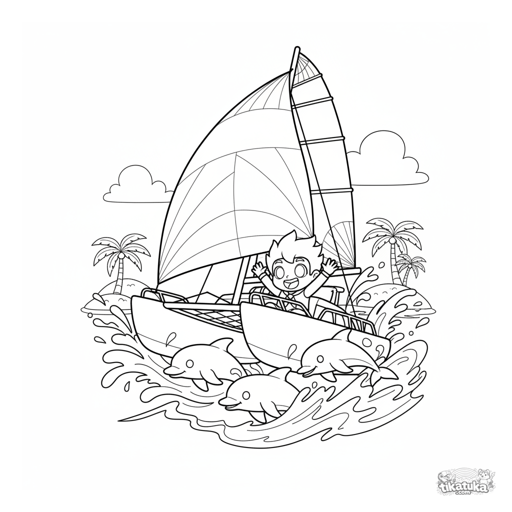 Página para colorear para niños 7-9: un veloz catamarán compite en una soleada bahía tropical, con su espinaquer inflado y delfines juguetones acompañándolo.