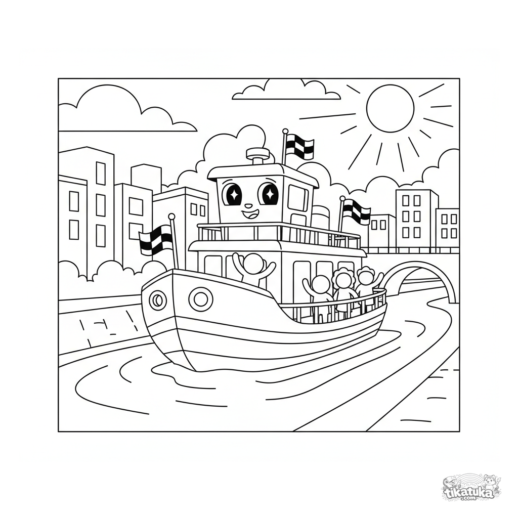 Página para colorear para niños de 4 a 6 años: un alegre ferry fluvial con banderas a cuadros cruza un canal urbano soleado.