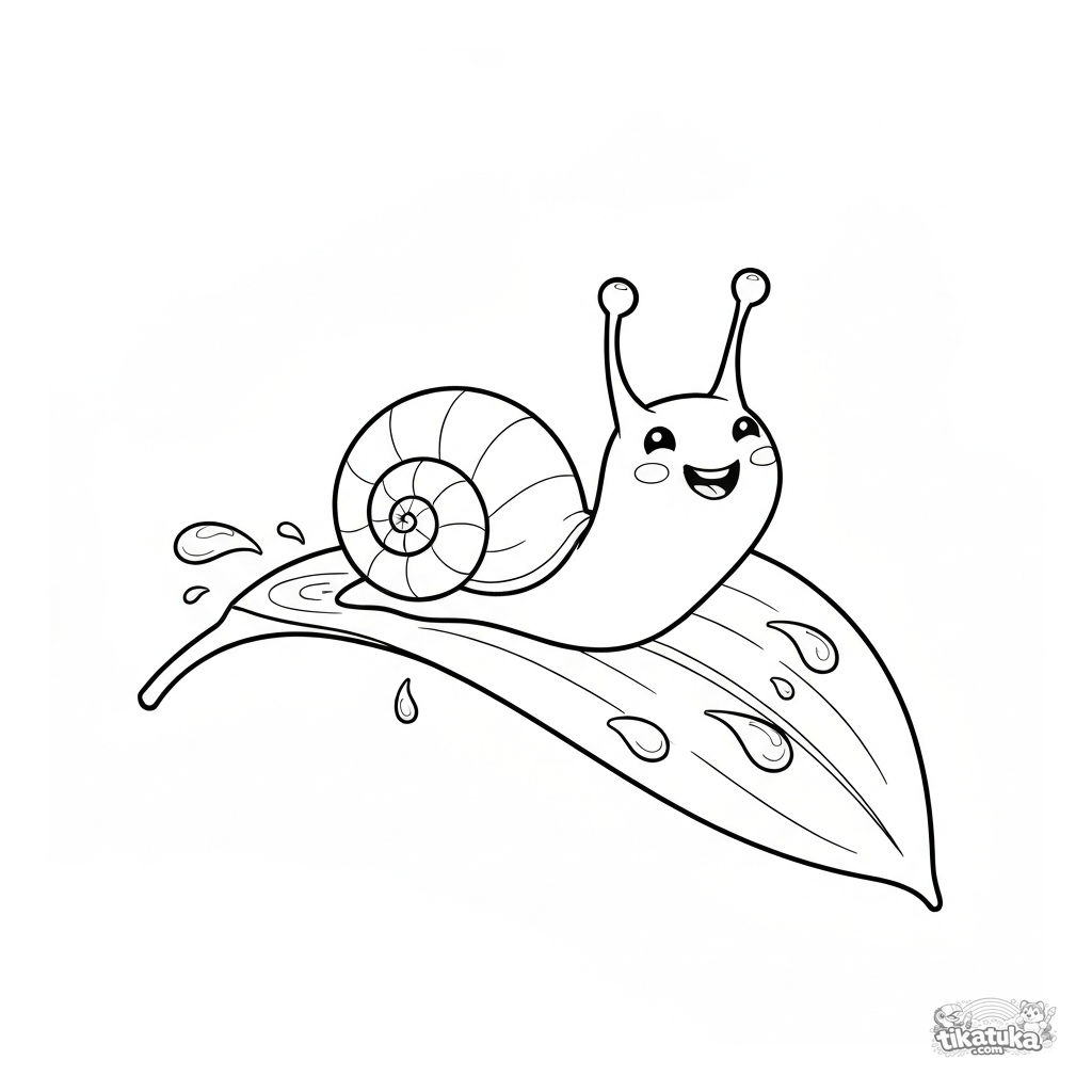 Página para colorear fácil de un caracol alegre para niños pequeños de 2 a 5 años. El caracol se desliza por una hoja mojada tras la lluvia.