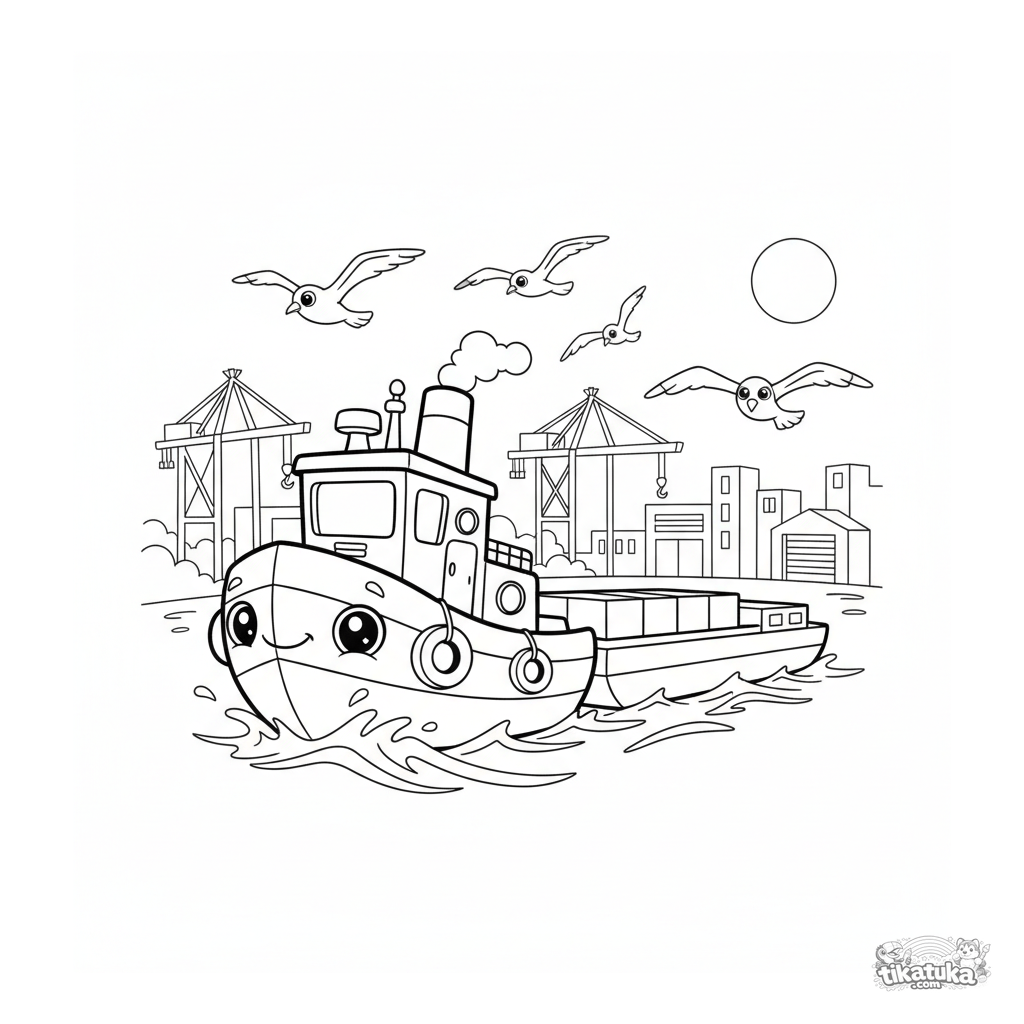 Página para colorear para 7-9 años: un remolcador alegre empuja una barcaza de carga en un puerto soleado y concurrido. Escena dinámica con gaviotas y grúas.