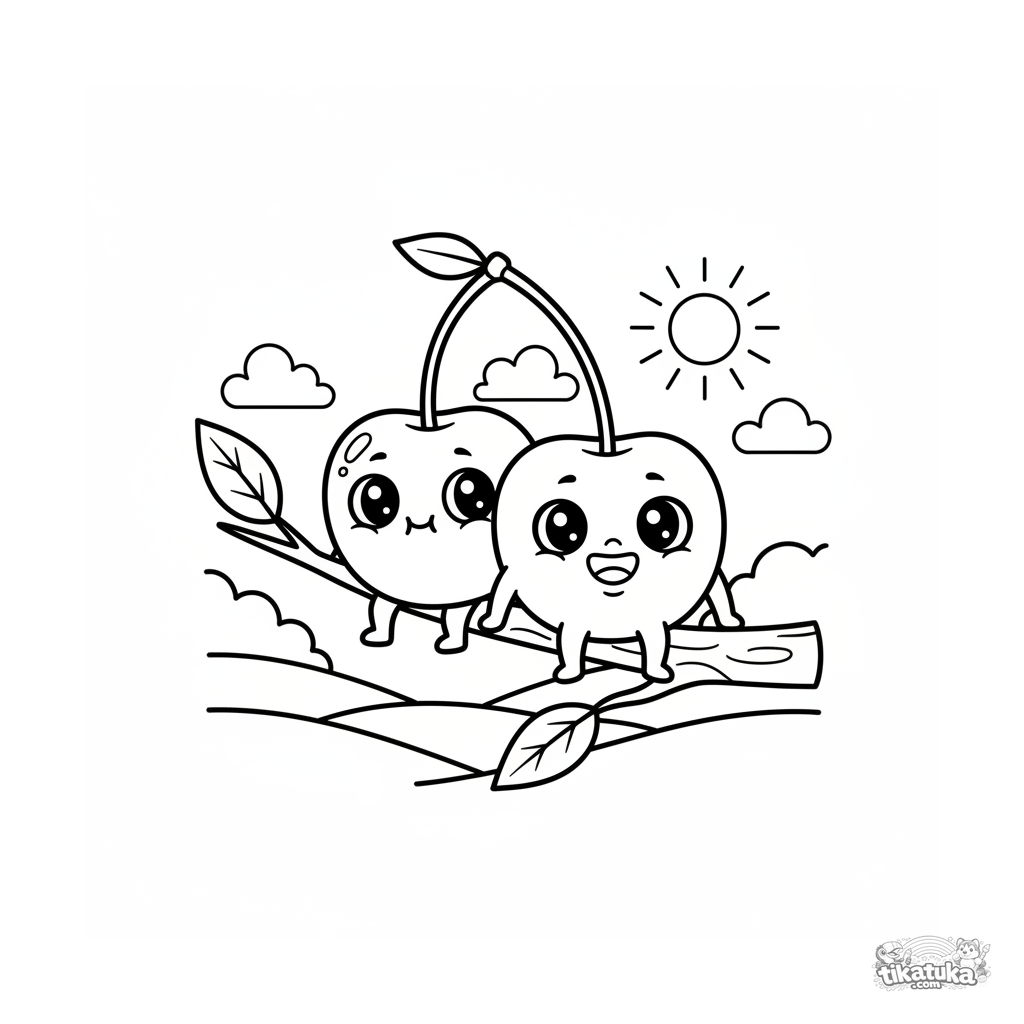 Página para colorear para niños 4-6: dos alegres cerezas chibi en una ramita, una escondiéndose detrás de la otra. Interacción linda, formas simples, estado de ánimo juguetón.