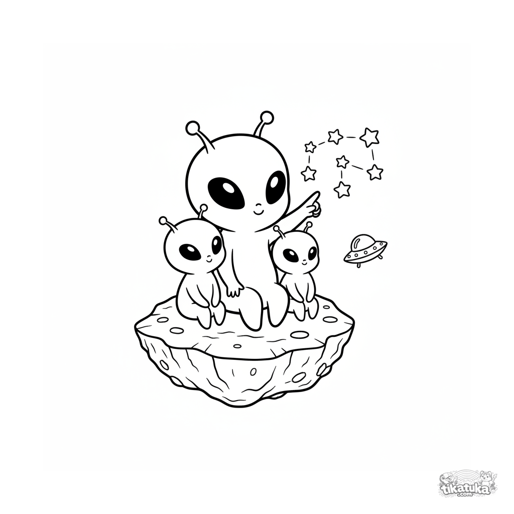 Página para colorear para 4-6 años: una linda familia alienígena chibi sentada en un asteroide observando estrellas en el espacio exterior. Formas simples y amigables.