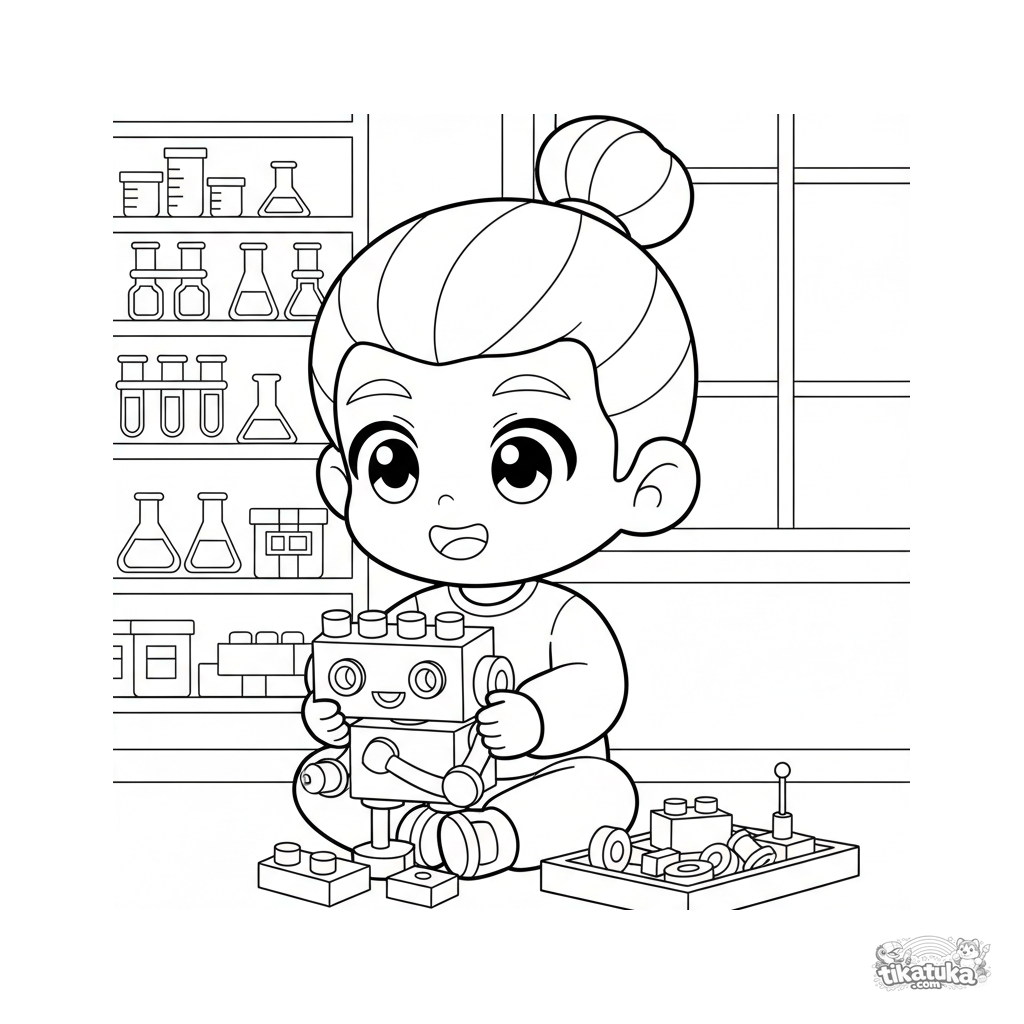 Página para colorear para niños de 4-6 años en estilo chibi: un lindo niño en un laboratorio secreto ensambla un robot pequeño con piezas grandes de bloques de construcción.