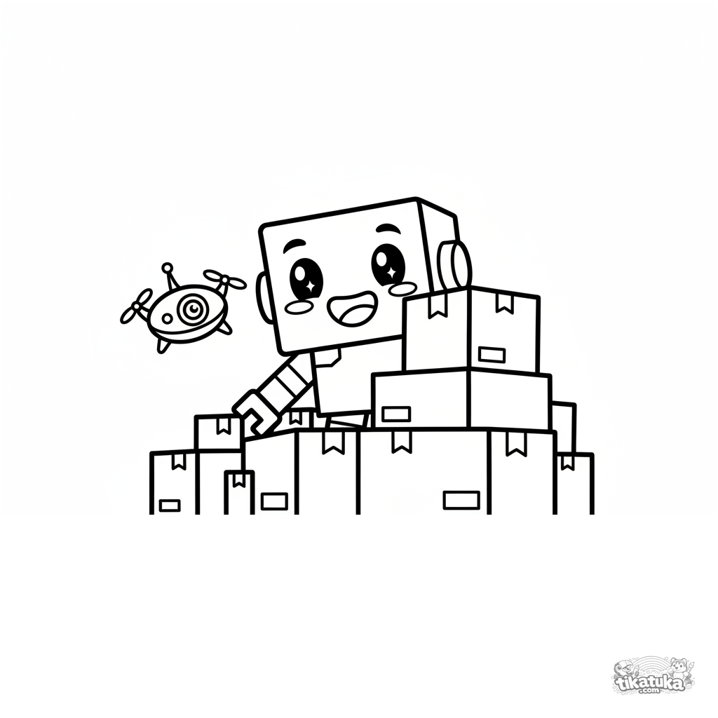 Página para colorear simple para bebés 2-3: un lindo robot caja jugando al escondite en un almacén. Formas grandes, contornos muy gruesos.