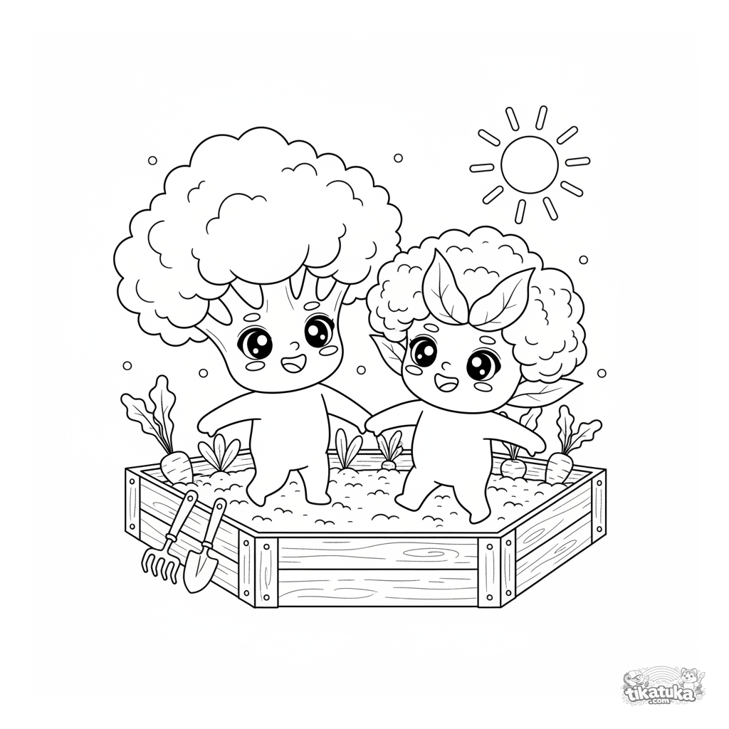 Página para colorear para niños 4-6: alegres verduras chibi, brócoli y coliflor, bailando en un huerto. Personajes brillantes y escena simple.