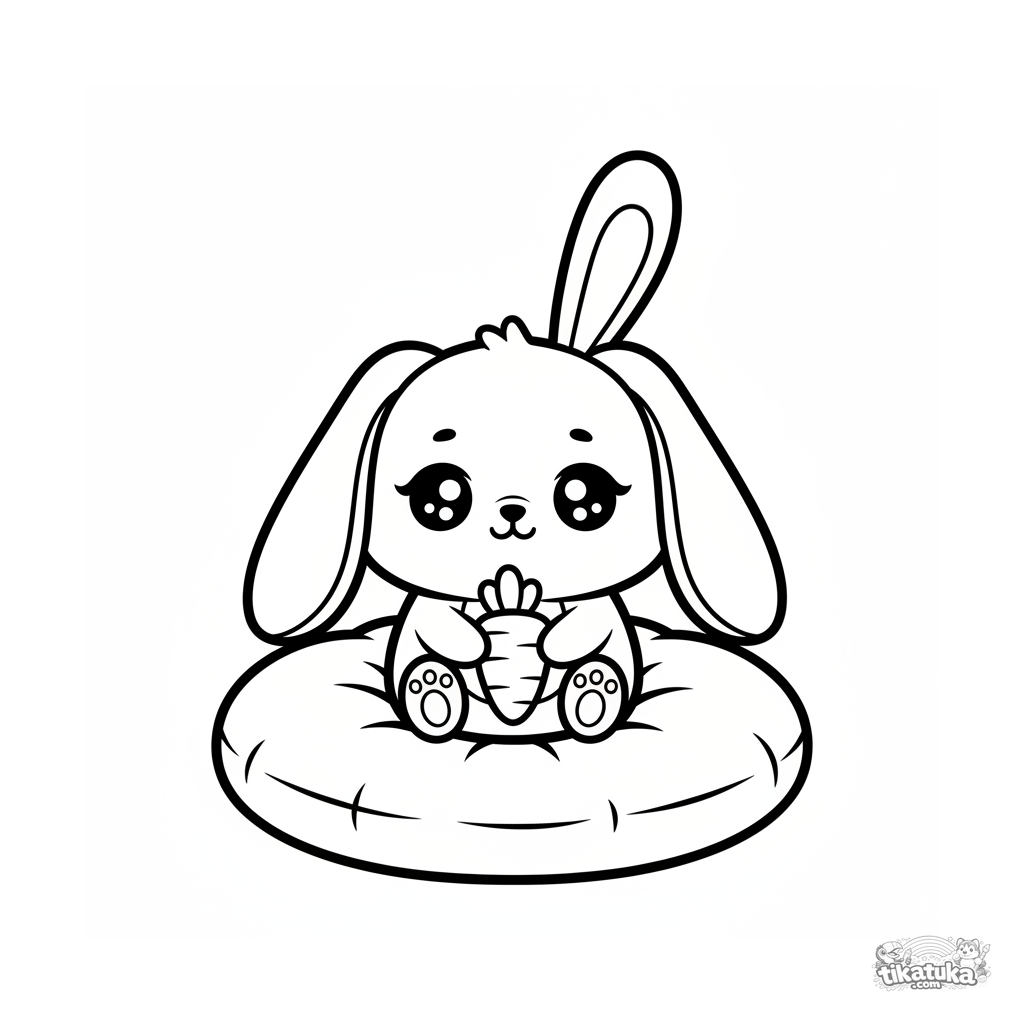 Página para colorear para niños de 2-3 años: un conejito de peluche sentado en un cojín suave. Formas grandes y simples, pocos detalles.