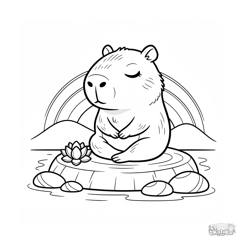 Página para colorear de un lindo carpincho chibi meditando en una roca al atardecer. Para niños de 4 a 6 años. Escena simple y dulce.