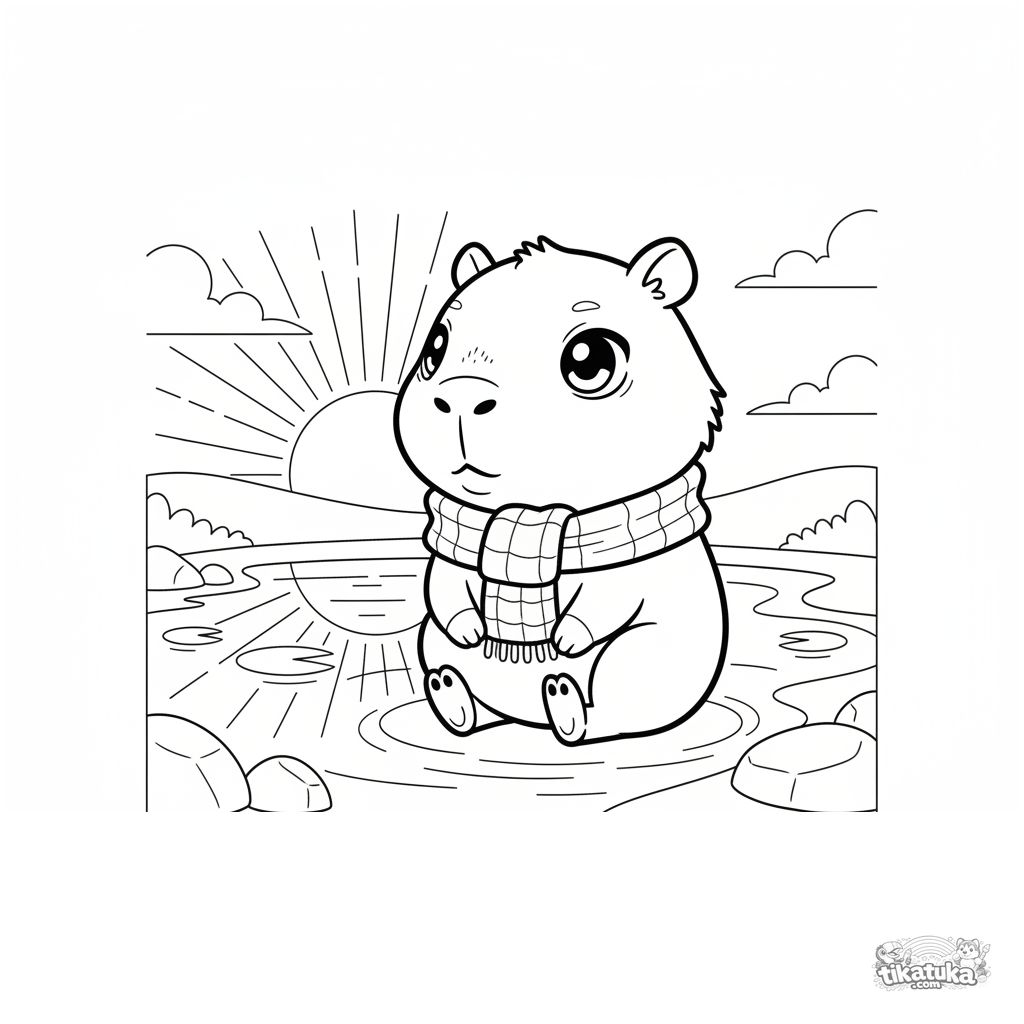 Lindo capibara chibi con bufanda sentado junto a un estanque al atardecer. Página para colorear para niños de 4 a 6 años con formas simples.