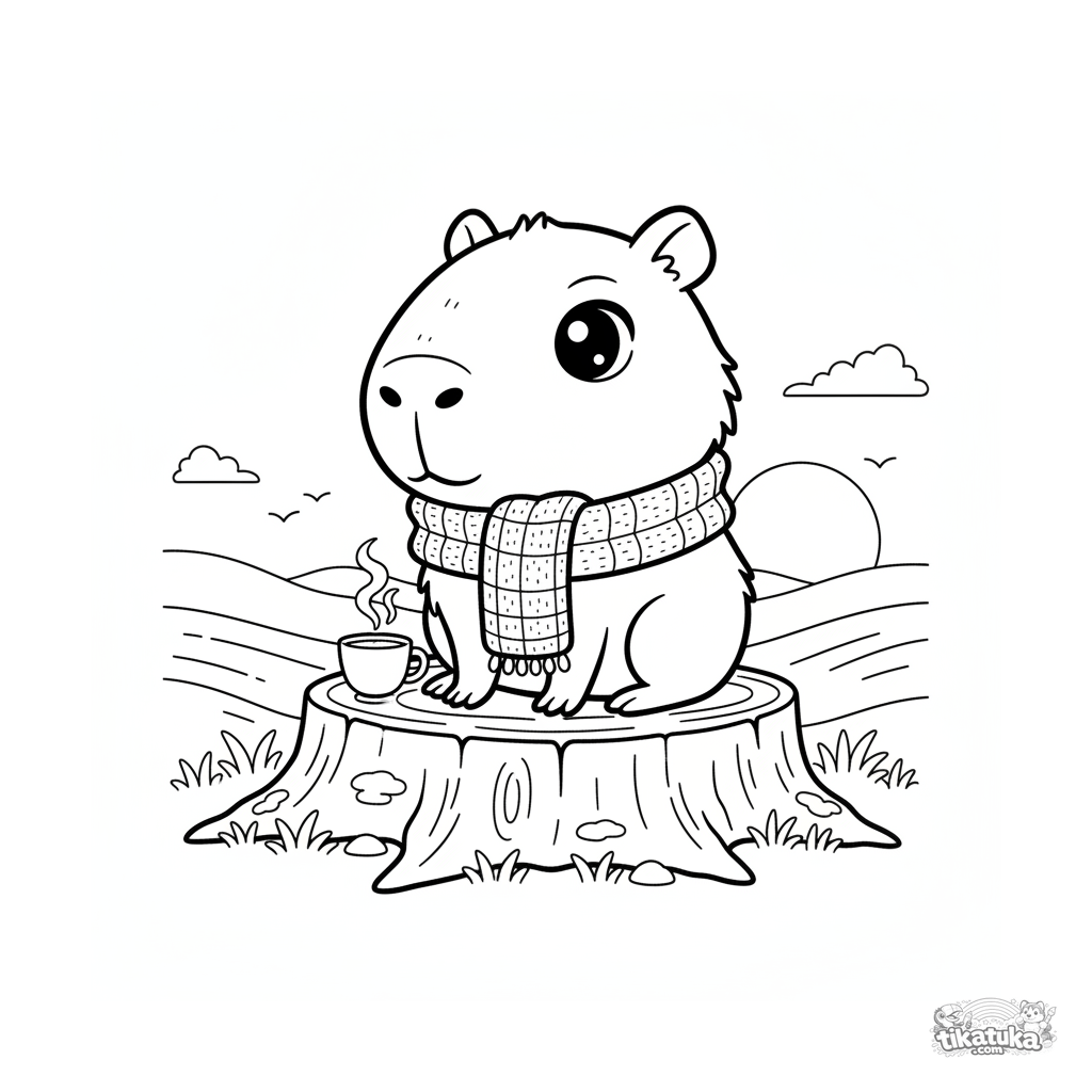 Página para colorear estilo chibi para niños de 4-6 años: un capibara con bufanda en un tocón observa el atardecer. Formas simples y atmósfera acogedora.