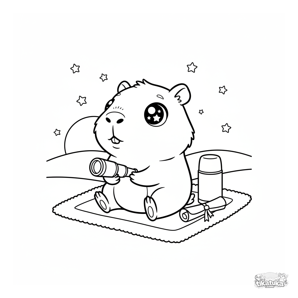 Página para colorear estilo chibi: un capibara astrónomo con telescopio espera el atardecer. Para niños de 4 a 6 años, formas simples.