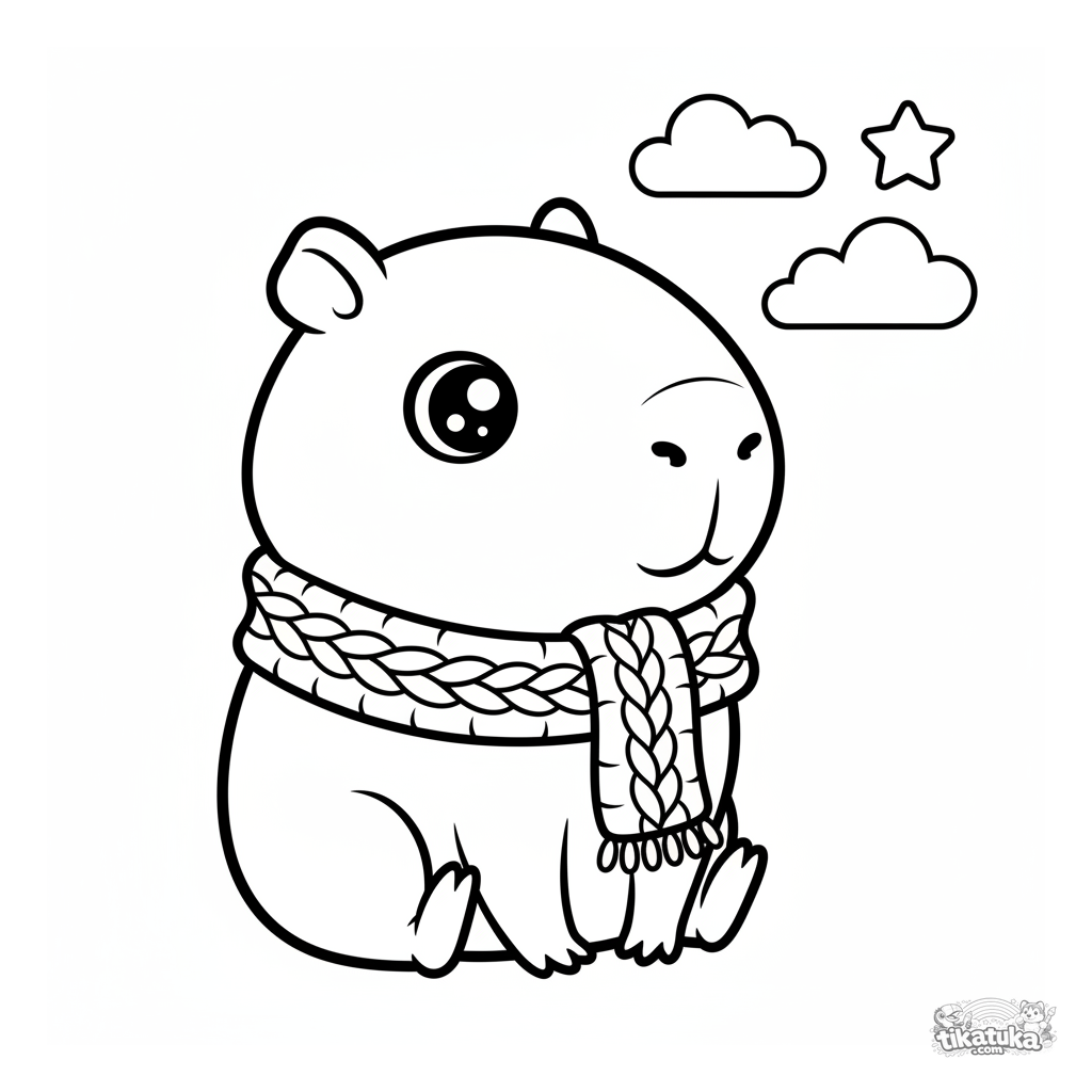Página simple para colorear para niños pequeños 2-3: un lindo carpincho chibi con bufanda sentado mirando el atardecer.