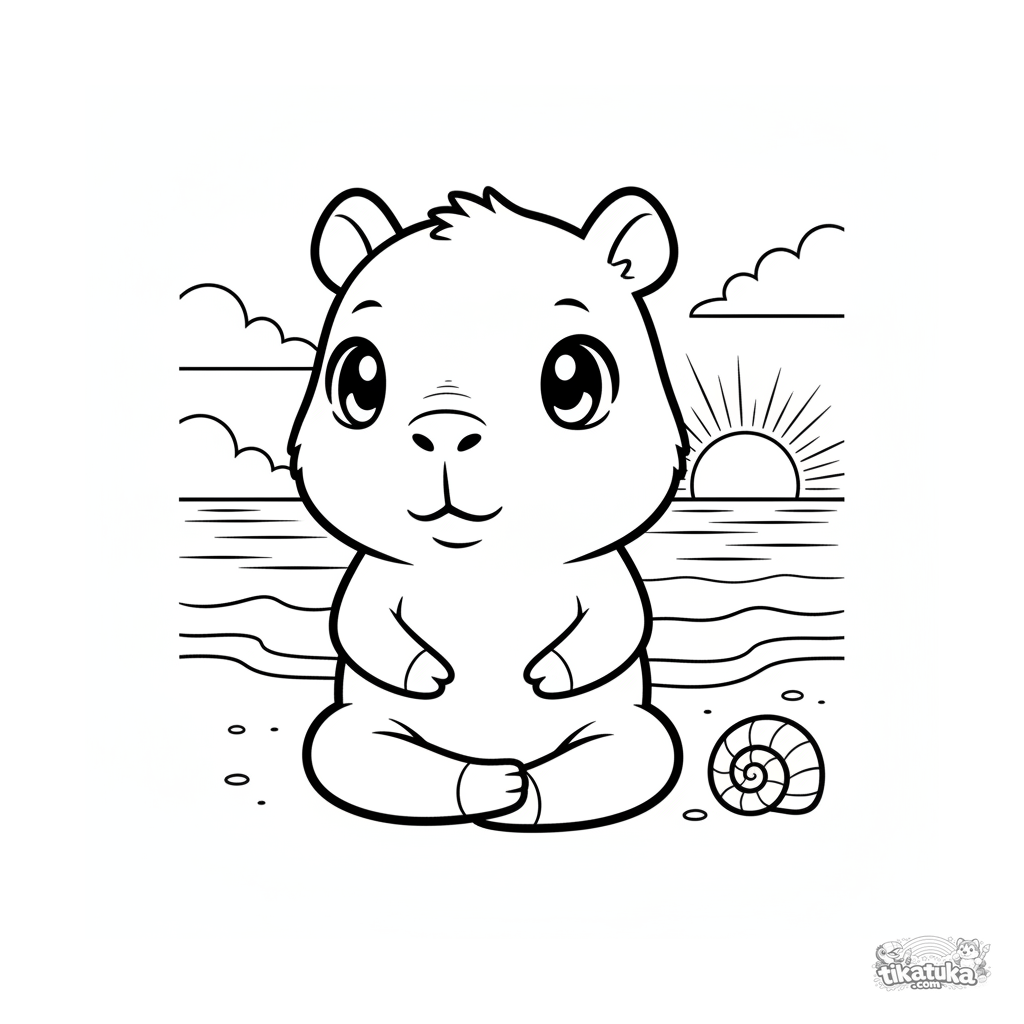 Página para colorear para niños de 4 a 6 años: un lindo capibara chibi haciendo yoga en la playa al atardecer. Formas simples, escena tranquila.