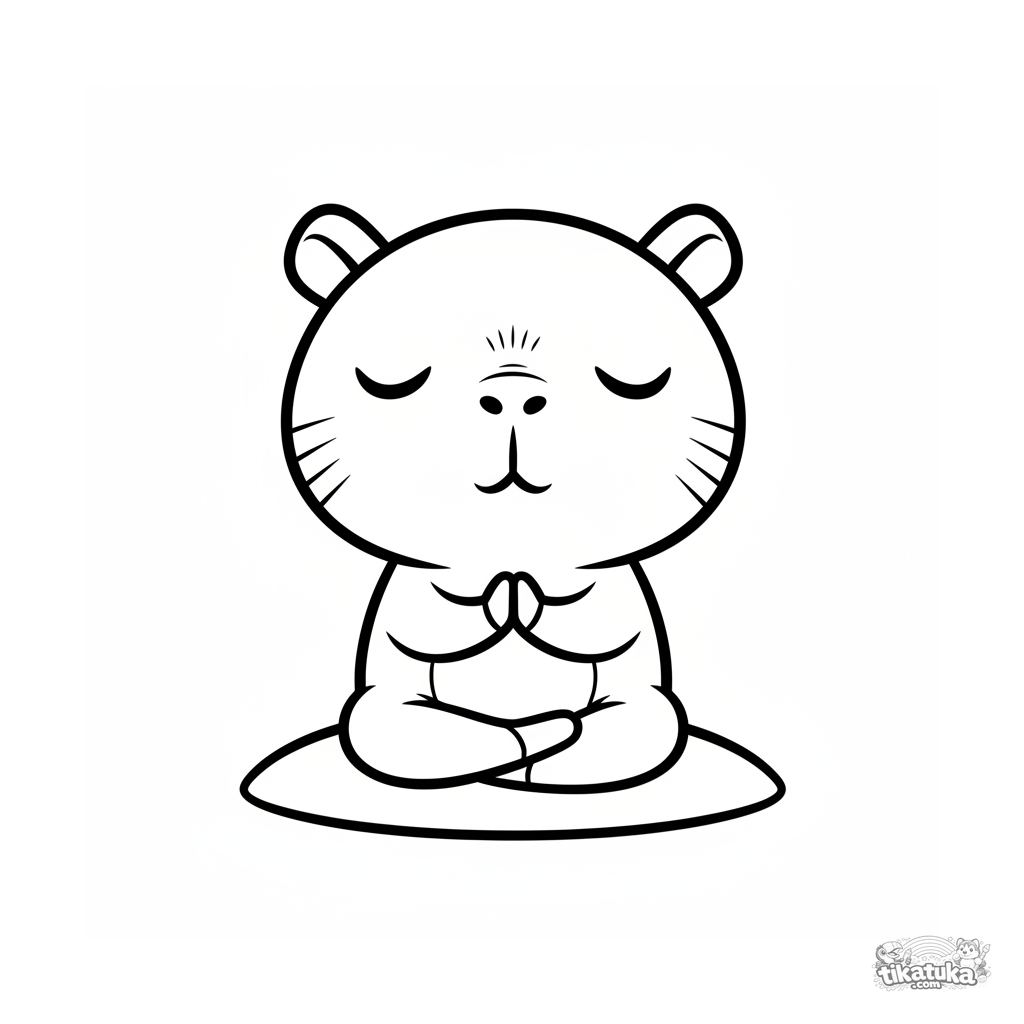 Página simple para colorear para niños de 2-3 años: un carpincho chibi meditando al atardecer. Formas grandes, contornos gruesos.