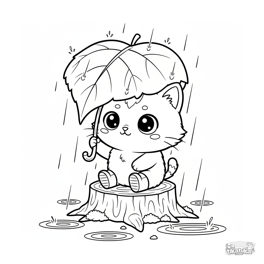 Página para colorear para niños de 4-6 años estilo chibi: un lindo gatito con botas se esconde de la lluvia bajo una gran hoja de arce. Escena divertida y simple.