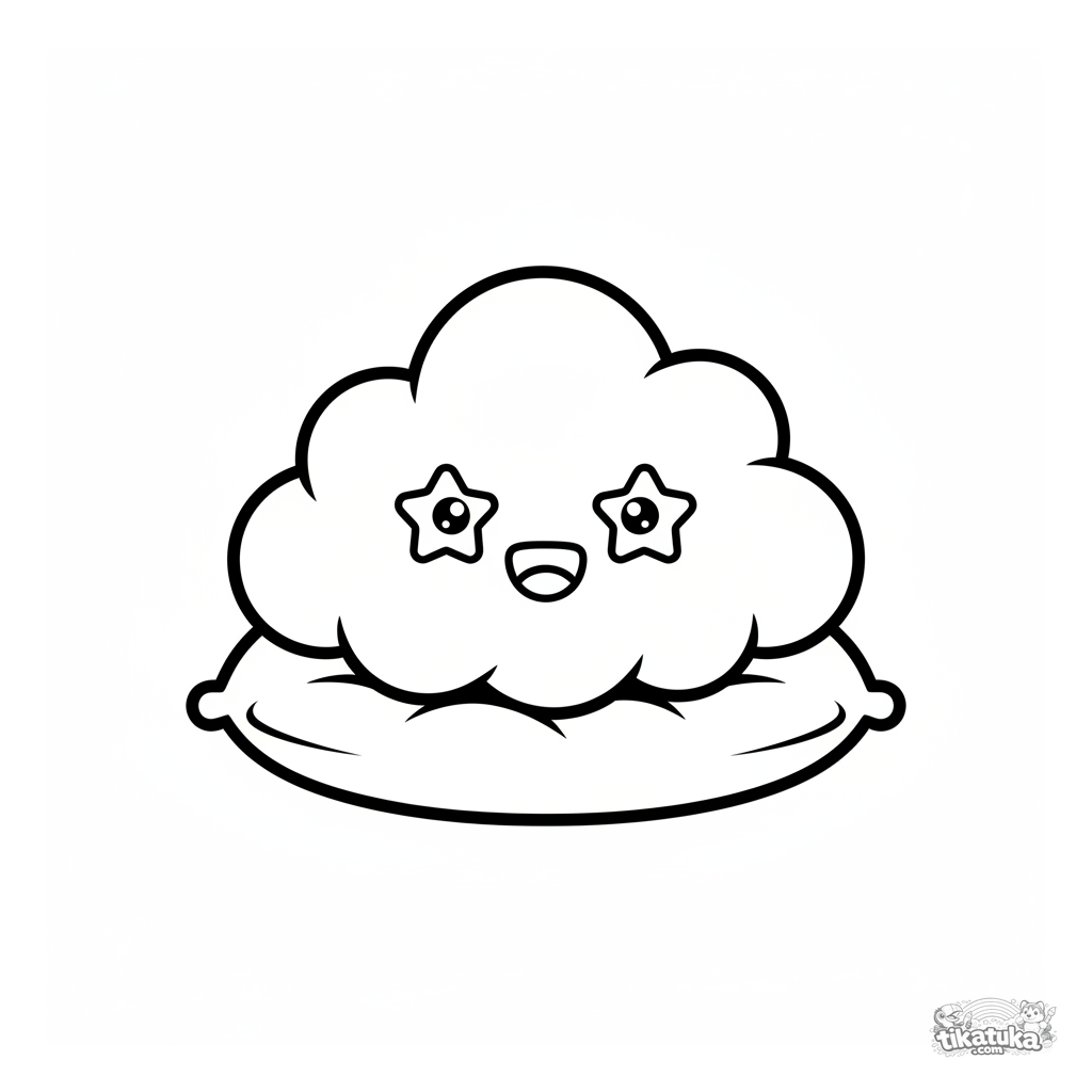 Página para colorear para niños pequeños: una nube esponjosa chibi con una cara linda sentada en un cojín suave. Formas grandes y simples, ojos estrellados, perfecto para 2-3 años.