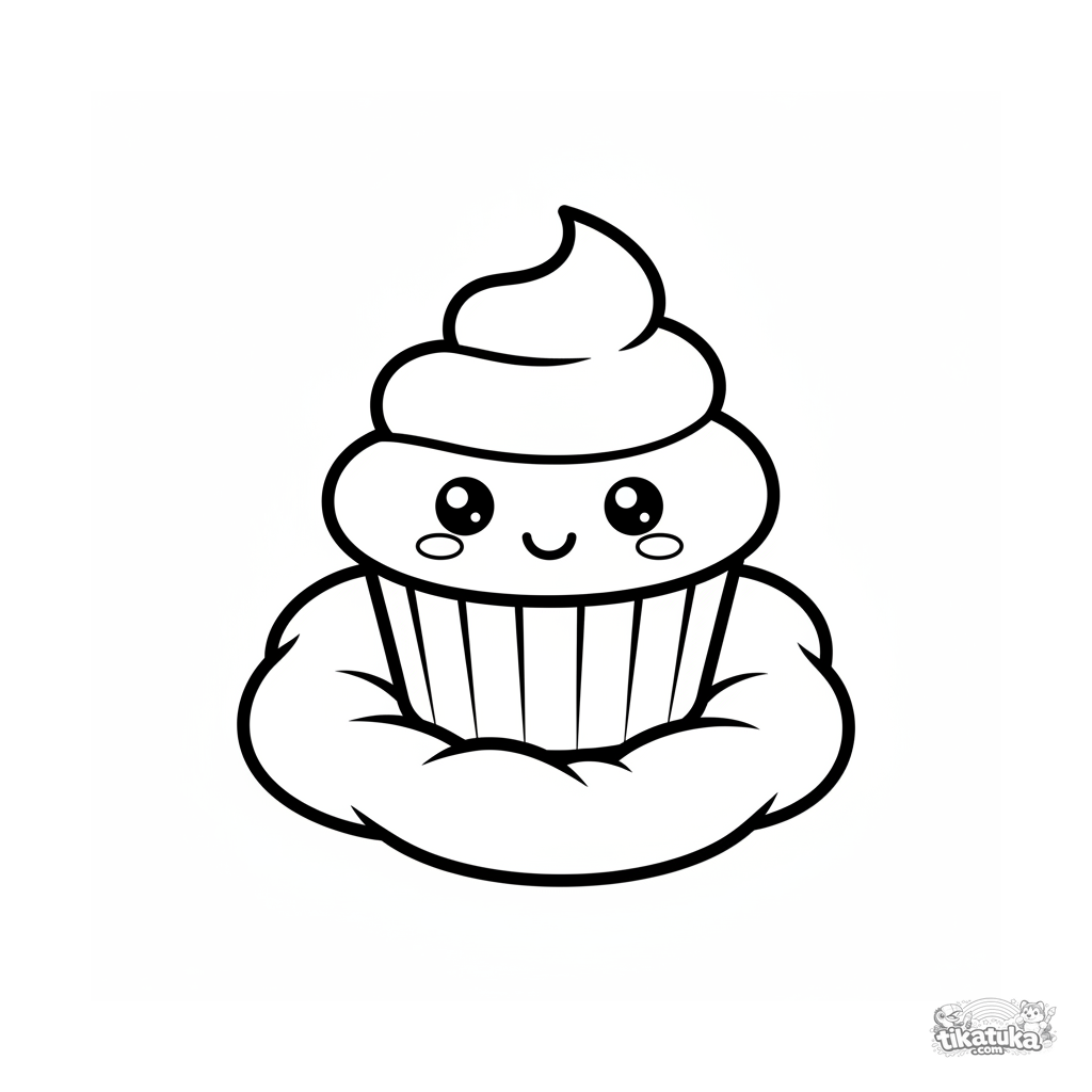 Página para colorear para niños pequeños en estilo chibi: una magdalena sonriente con ojos de cereza se sienta en un almohadón. Formas redondeadas grandes.