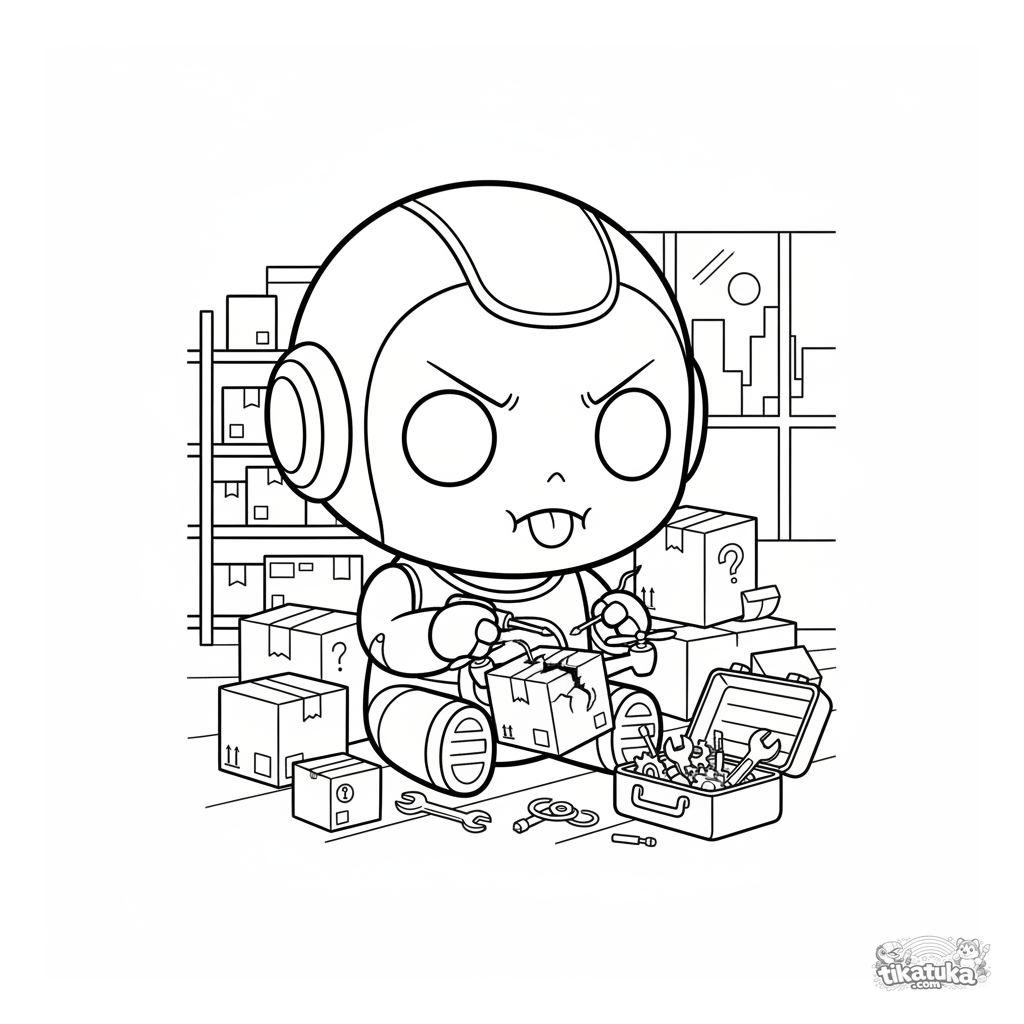 Página para colorear para niños: un robot chibi repara un dron pequeño en el suelo del almacén. Caja de herramientas abierta cerca. Ilustración divertida.