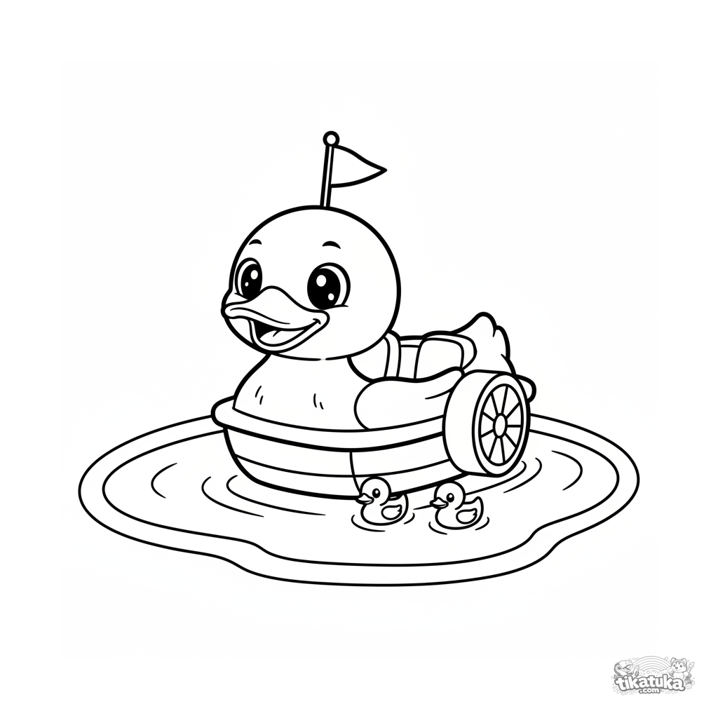 Página simple para colorear para niños pequeños de 2 a 3 años: un lindo bote de pedales con forma de pato en un estanque del parque.