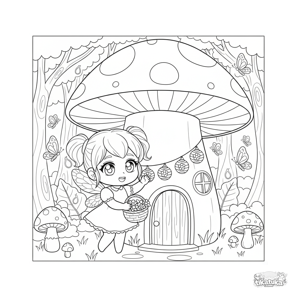 Página para colorear estilo chibi para niños 4-6 años: una princesa hada decora una casa de champiñón en un bosque encantado.