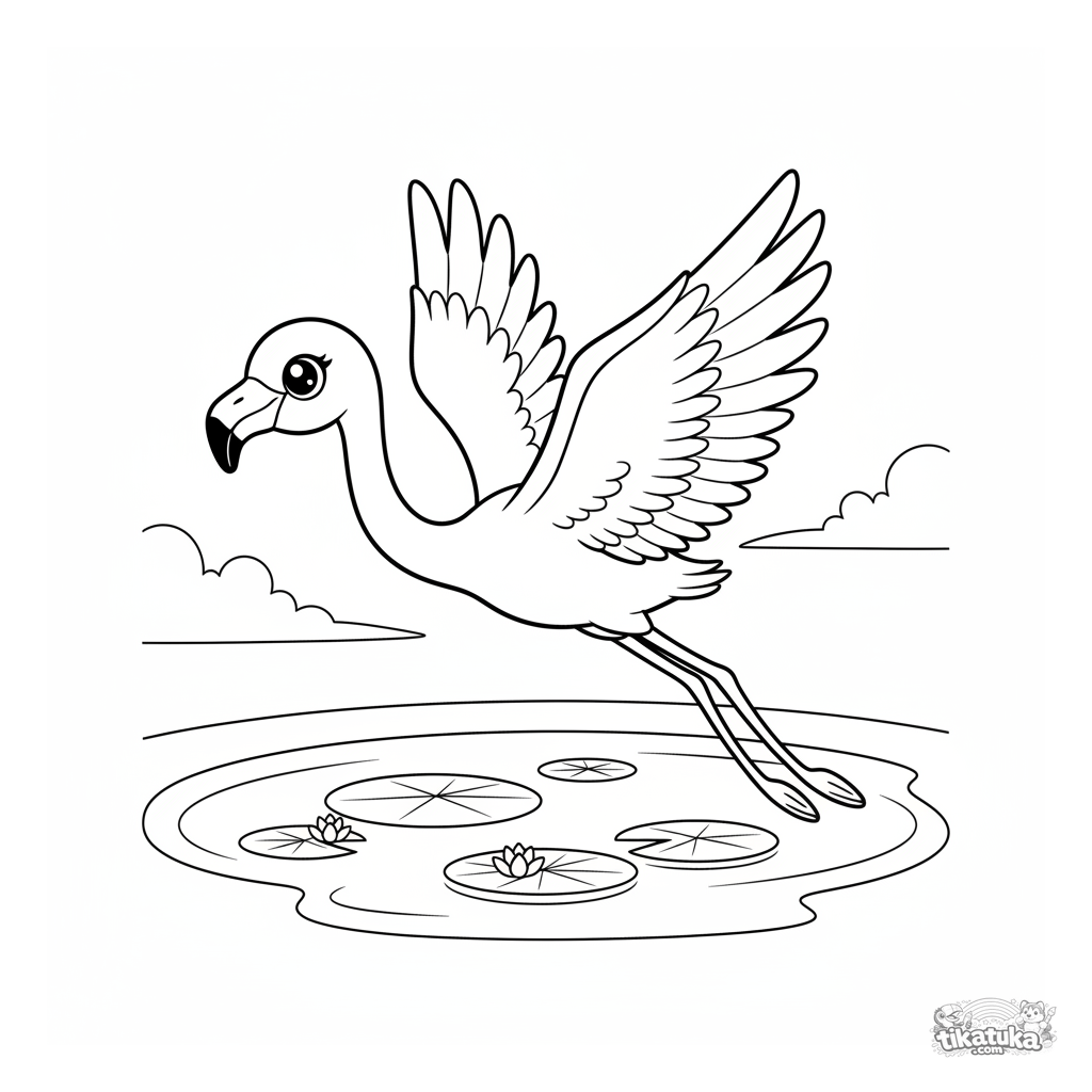 Página para colorear para niños: un adorable flamenco estilo chibi volando sobre un estanque al atardecer. Escena atractiva para edades 5-8 años.