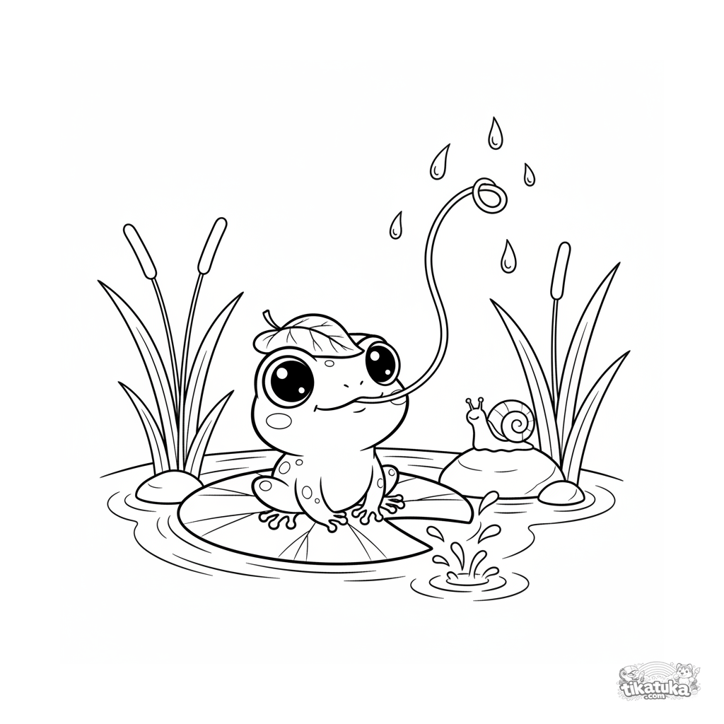 Página para colorear para niños (4-6 años) estilo chibi: una rana linda con sombrero de hoja sentada en un nenúfar atrapando gotas de lluvia. Ojos expresivos, composición simple.