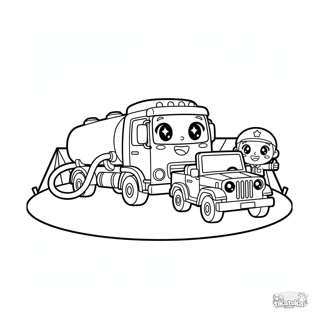Lindas páginas para colorear chibi para niños pequeños 2-3: un camión cisterna sonriente repostando un jeep militar cerca de las carpas del cuartel general.