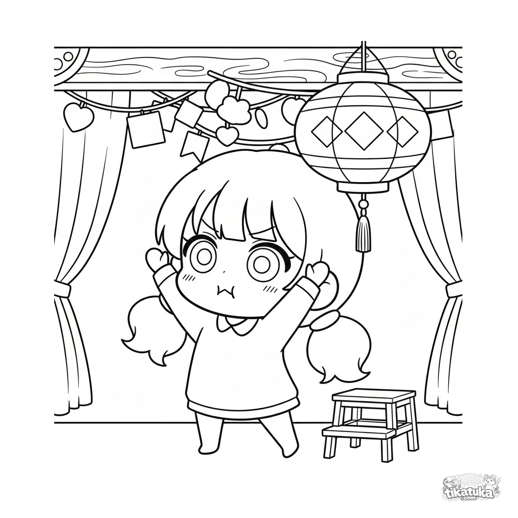 Página para colorear para niños de 7-9 años: una linda niña estilo chibi se estira para alcanzar una linterna de papel alta en un salón festivo. Cuerpo completo, amplios márgenes blancos.