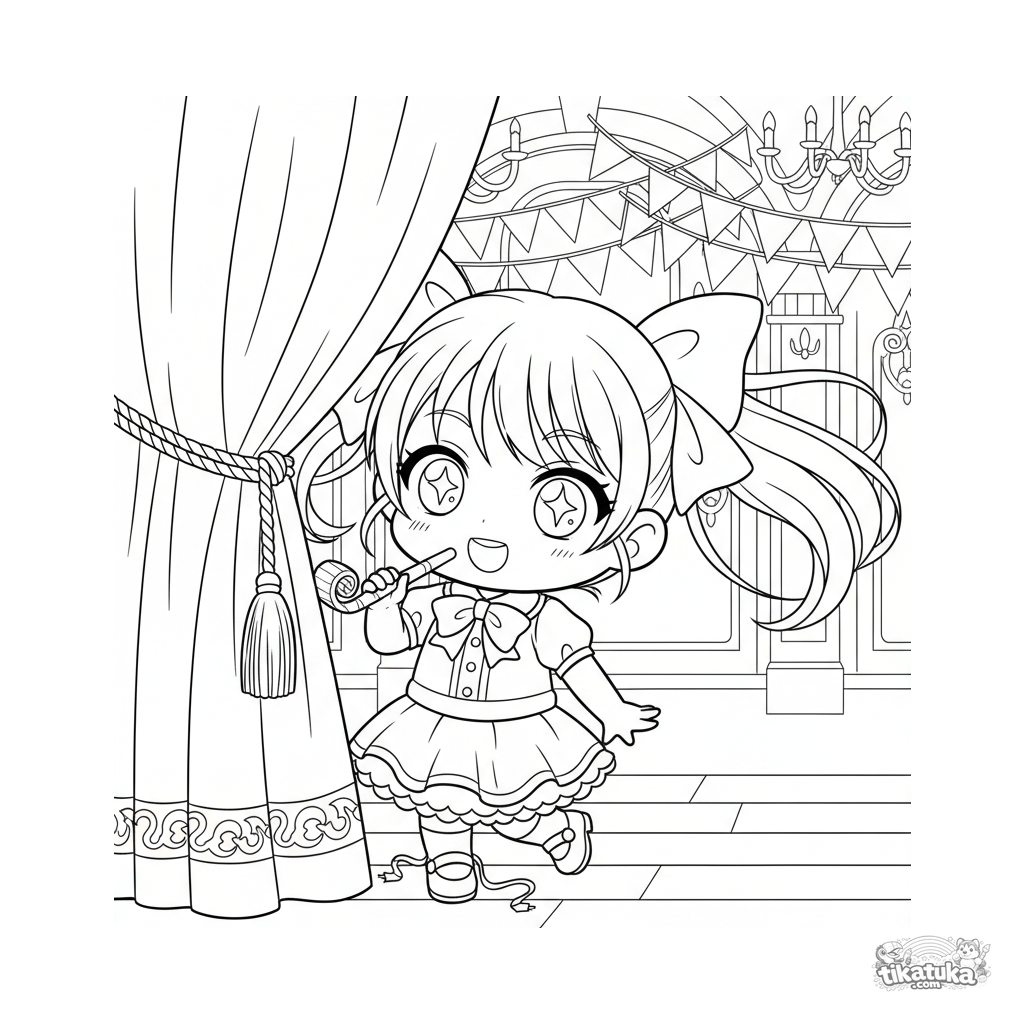 Página para colorear chibi para niños 4-6: una niña linda con coletas asomándose tras una cortina festiva. Escena de escondite.