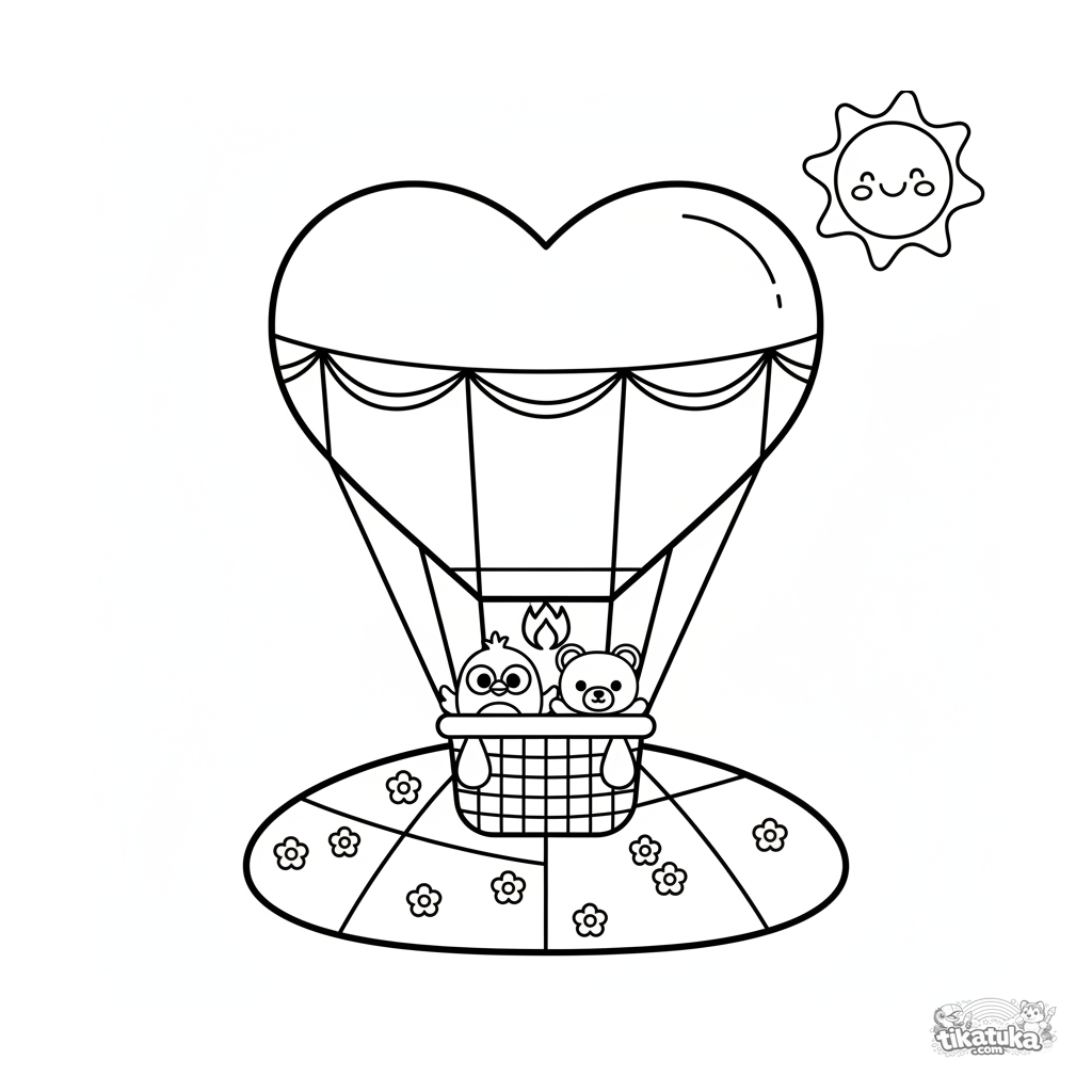 Página para colorear simple para niños pequeños de 2 a 3 años: un gran globo aerostático con forma de corazón con una cesta flota sobre un prado de flores brillante. Formas grandes y claras.