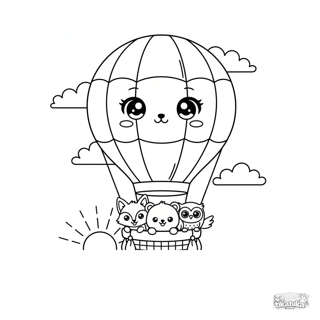 Página para colorear estilo chibi: un globo aerostático con cara vuela sobre el océano con amigos animales. Para 4-6 años. Formas simples.