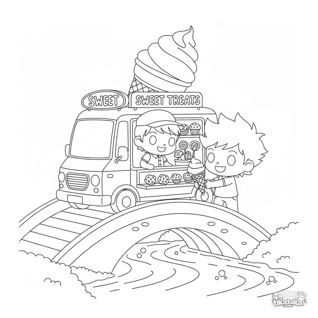 Página para colorear para niños 4-6: un lindo camión de helados chibi en un puente colorido sobre un río. Un vendedor alegre atiende a un cliente.