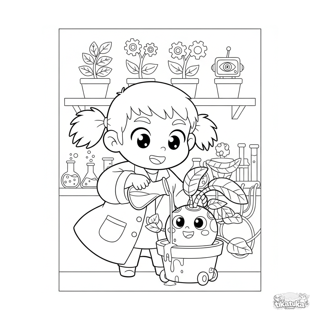 Página para colorear para niños 4-6 en estilo chibi: un niño inventor en un laboratorio alimentando un robot planta con líquido brillante. Formas lindas y simples.