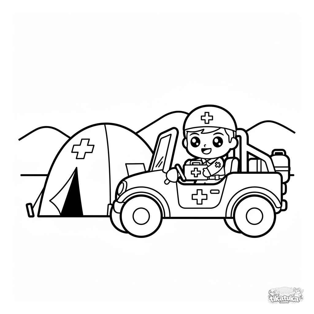 Página para colorear simple para niños pequeños de 2-3 años: un lindo buggy médico con una cruz roja está estacionado junto a una carpa de hospital de campaña. Formas grandes y simples.