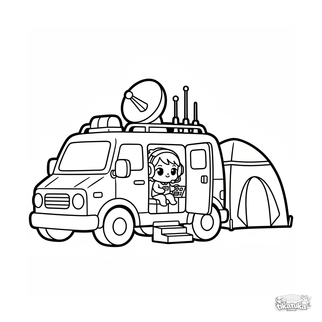 Página para colorear simple para niños pequeños de 2-3 años: una linda furgoneta de centro de mando móvil con antena parabólica, estacionada junto a una carpa de cuartel.