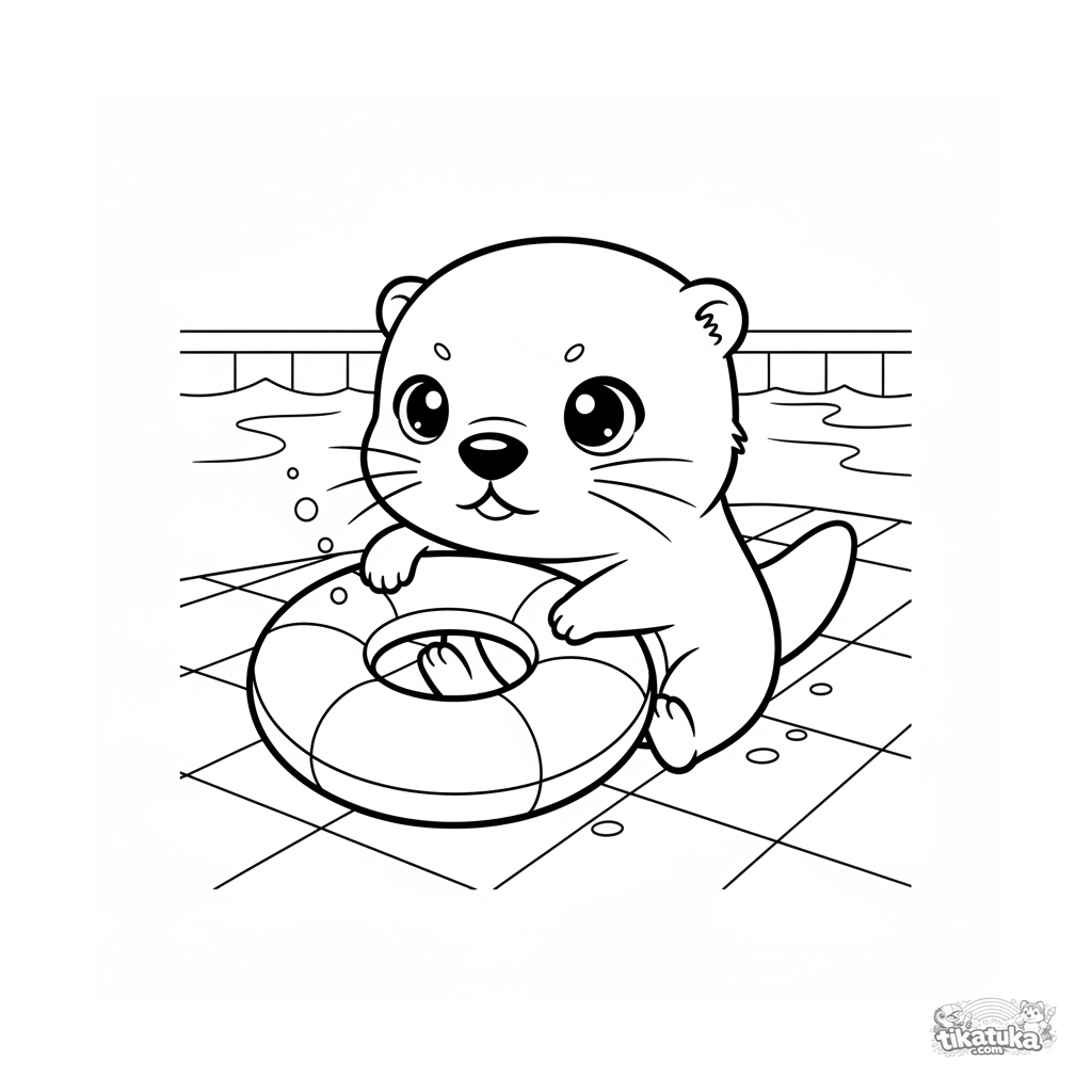 Página para colorear para niños de 7-9 años: una nutria en lindo estilo chibi juega con un aro inflable en el fondo de la piscina.