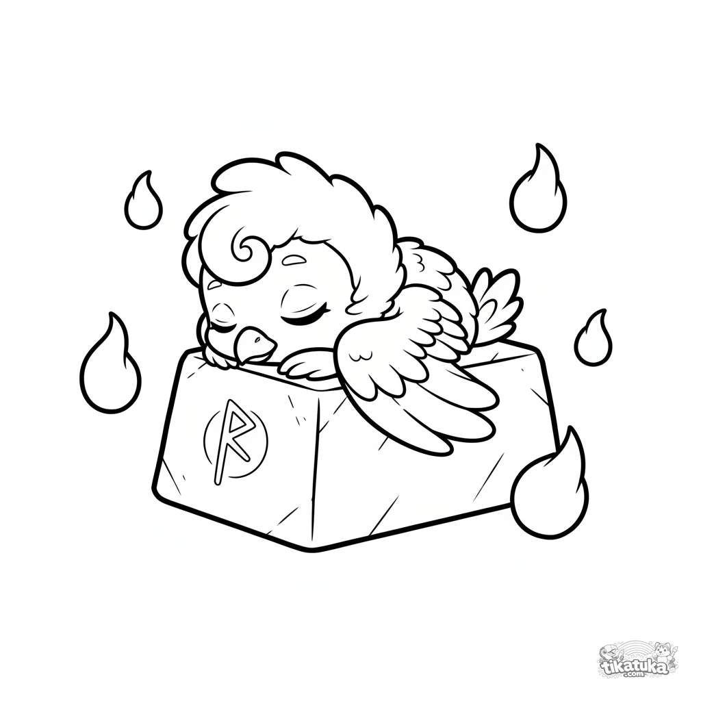Página simple para colorear para niños de 2-3 años: un fénix chibi duerme plácidamente en una piedra rúnica. Formas grandes y simples, perfectas para primeros lápices.