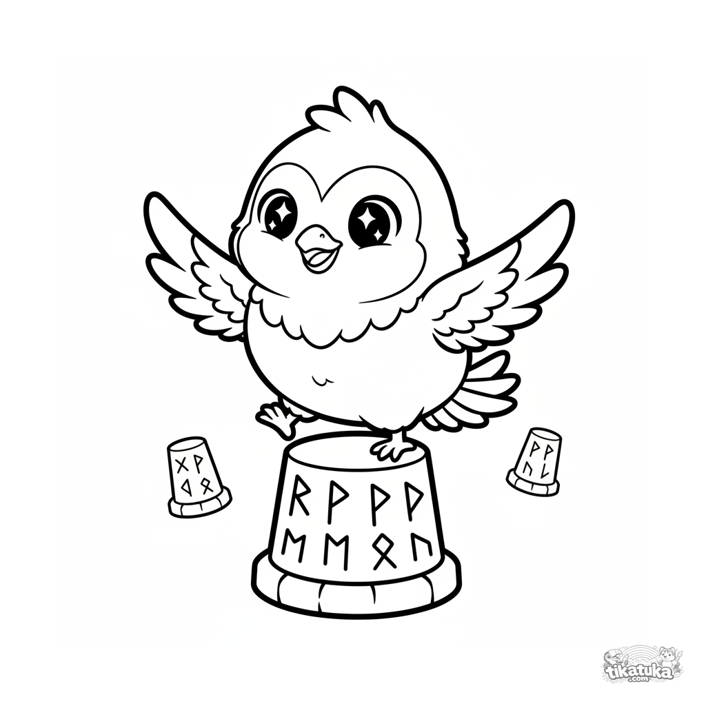Página para colorear para niños pequeños 2-3: un lindo fénix chibi se para en una piedra rúnica. Formas simples enormes, áreas amplias para colorear, muy pocos detalles.