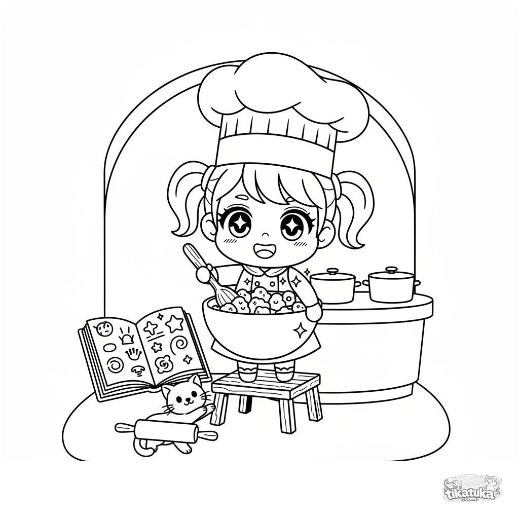 Página simple para colorear para niños pequeños 2-3: una princesa chibi con un gran gorro de chef hornea galletas mágicas en una cocina de castillo. Formas grandes y lindas, un gatito juguetón.