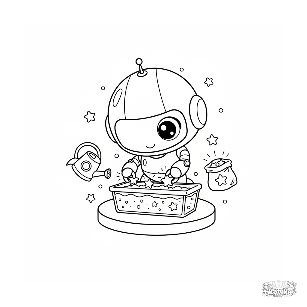 Página para colorear para 7-9 años: un lindo robot chibi planta semillas mágicas de luz estelar en una plataforma pequeña en el espacio exterior. Dulce y suave escena cósmica para colorear.