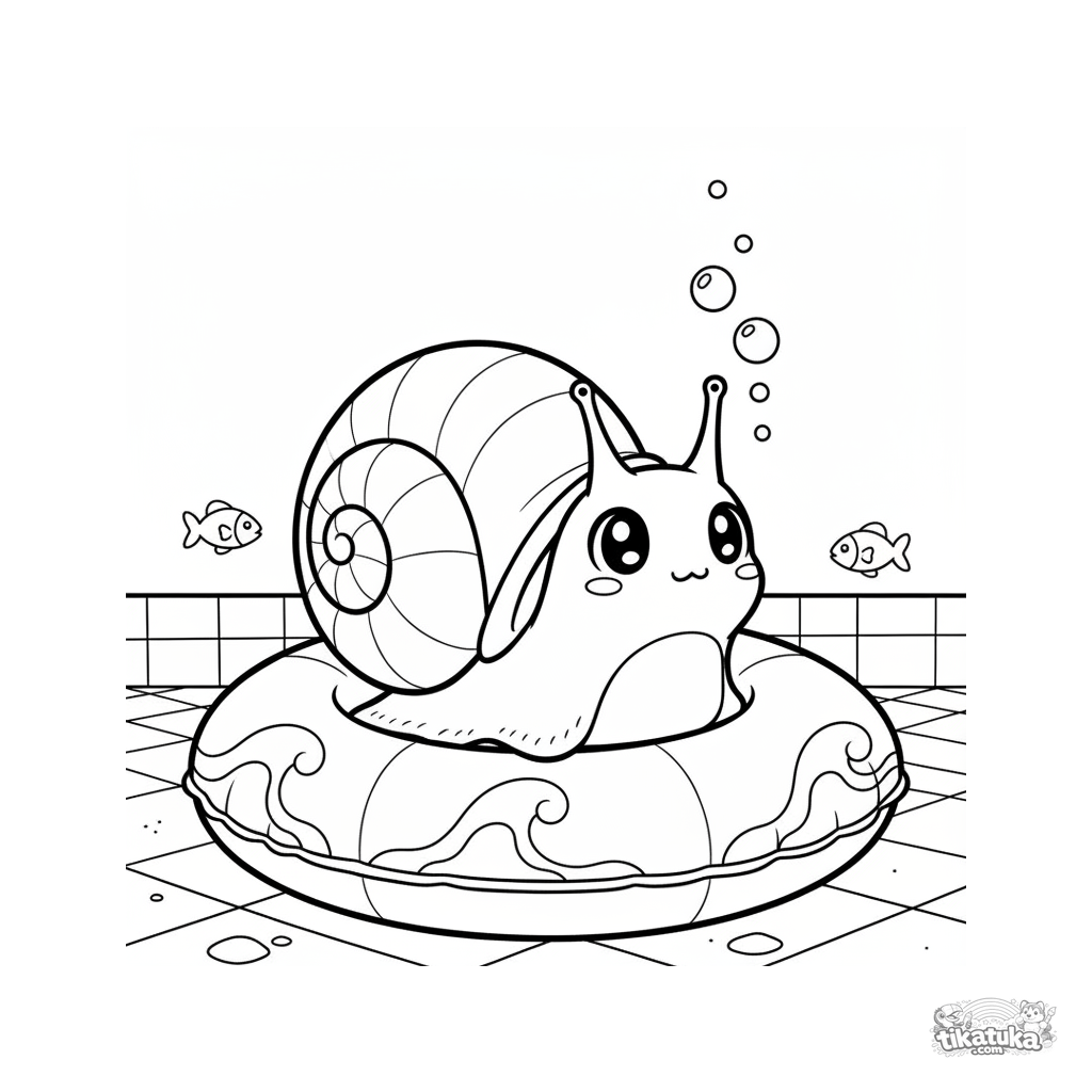 Página para colorear para niños de 4-6 años: un lindo caracol estilo chibi asoma por la válvula de un aro inflable en el fondo de la piscina.
