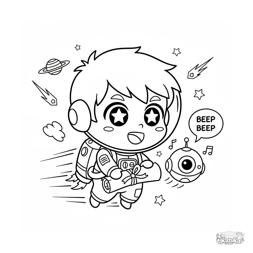 Página para colorear para niños 7-9: un explorador espacial chibi energético se desplaza por el espacio exterior con una mochila propulsora y un mapa estelar. Escena dinámica y divertida.