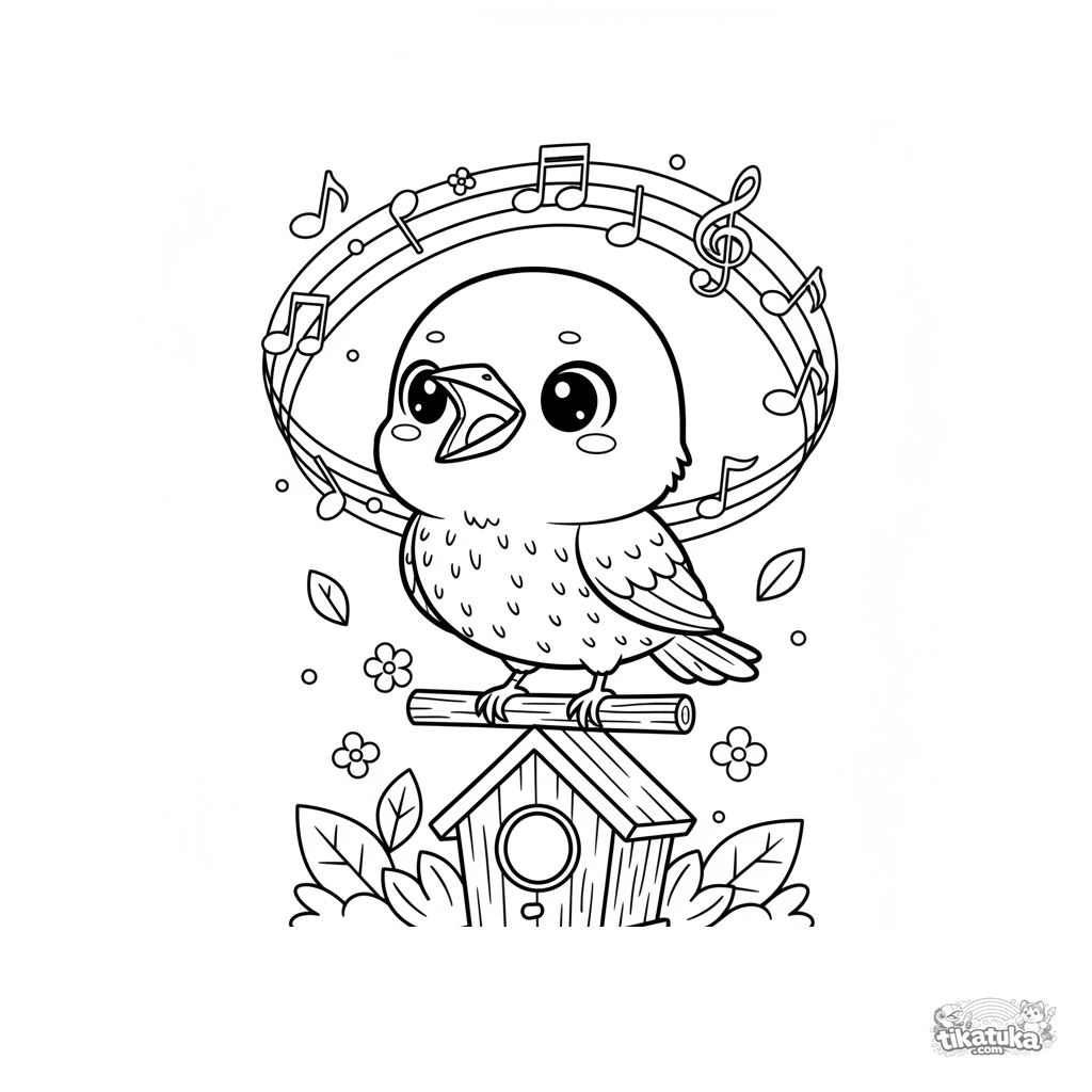 Página para colorear para niños 4-6 en estilo chibi: un estornino feliz canta en la percha de una casa de pájaros de madera. Cabeza grande, formas simples, con notas musicales flotantes.