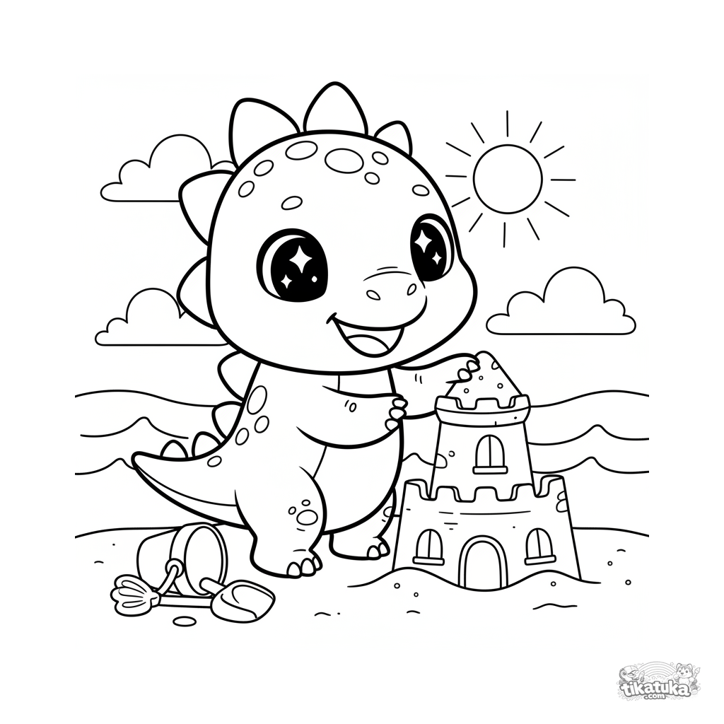 Página para colorear para niños 4-6: un lindo stegosaurus chibi construye un castillo de arena en una playa antigua. Escena divertida, cuerpo completo, amplios márgenes blancos.