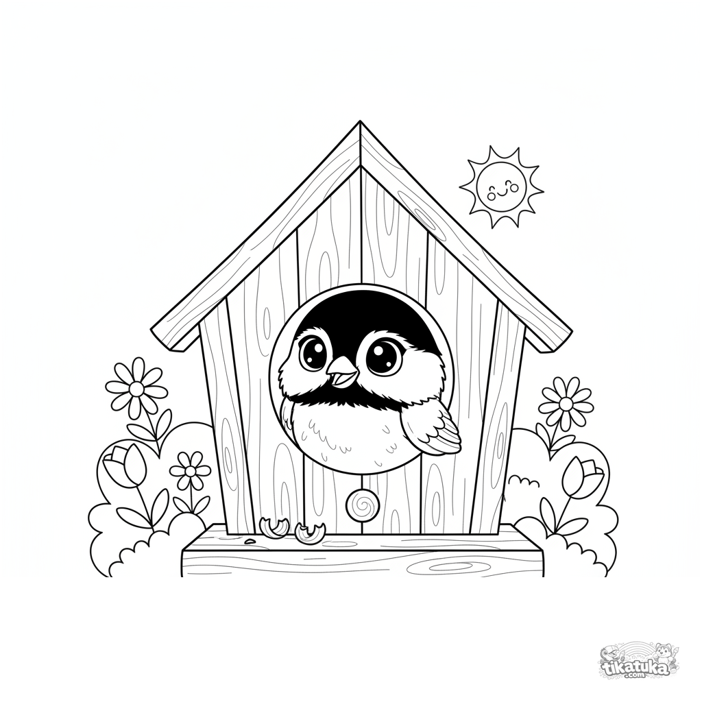 Página para colorear para niños 4-6: un carbonero asomándose por el agujero redondo de una pajarera de madera en un jardín. Escena linda y simple.