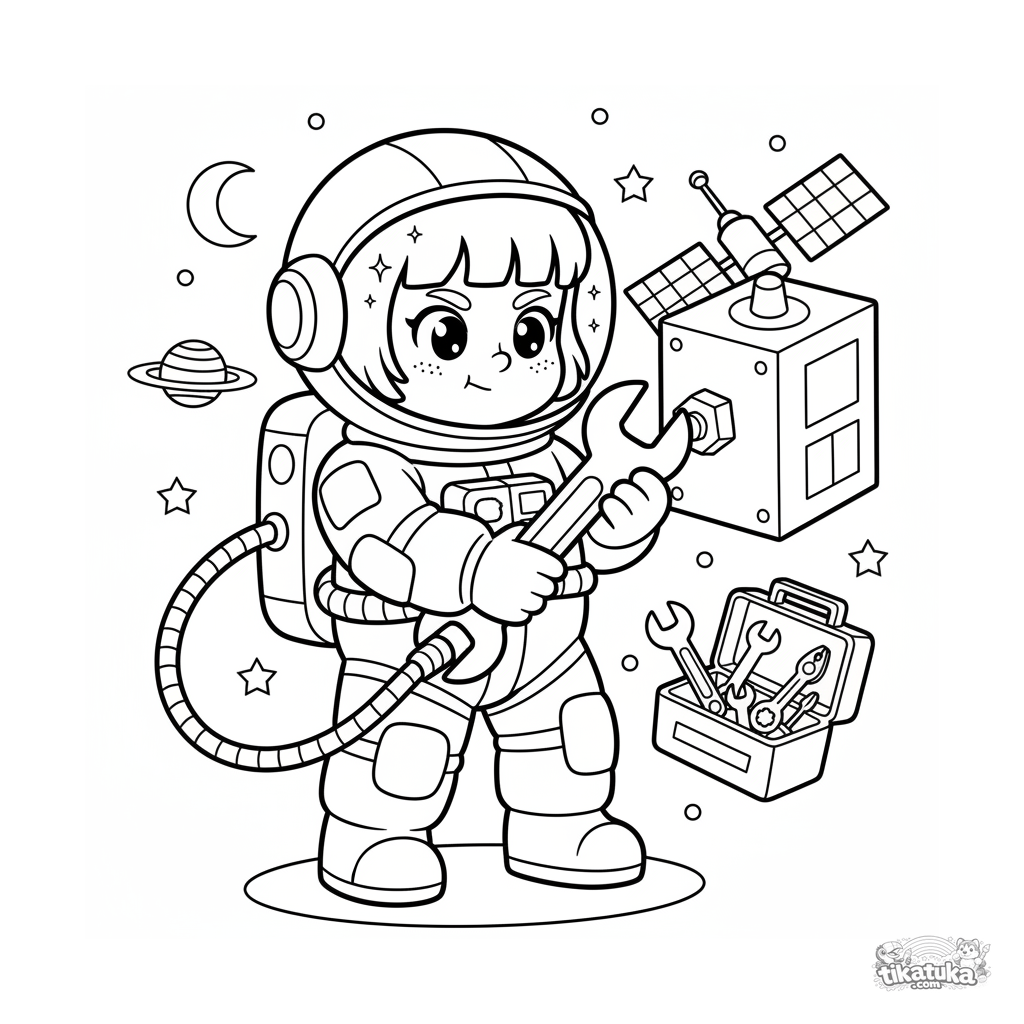 Página para colorear para niños 4-6: un joven astronauta en un paseo espacial reparando un satélite. Escena dinámica con herramientas.