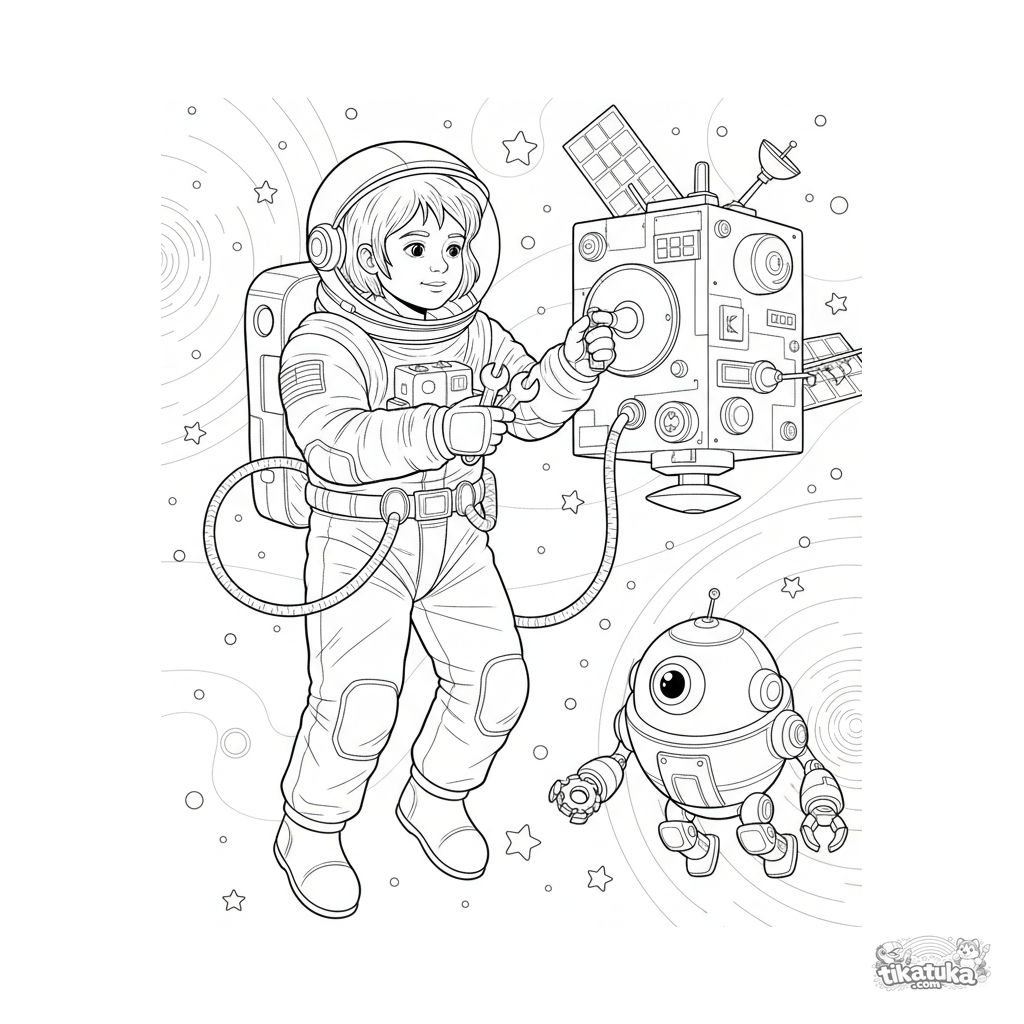 Página para colorear para niños mayores 10-12: un niño astronauta repara un satélite en el espacio, ayudado por un robot, con estrellas de fondo.